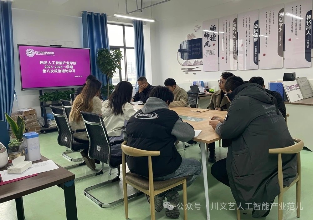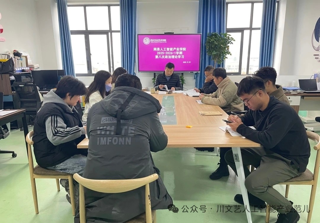 2025年12月22日,网易人工智能产业学院2025-2026-1学期第八次教职工政治理论学习会议在梓潼校区B栋教学楼707成功开展。本次学习由网易人工智能产业学院副院长(兼)党支部副书记张新领学,参学人员有:周宁、单文博、胡广泽、李雨桐、青诗恒、杨腾皓、龙凤、黄燕、叶鑫萍、邓思琪。