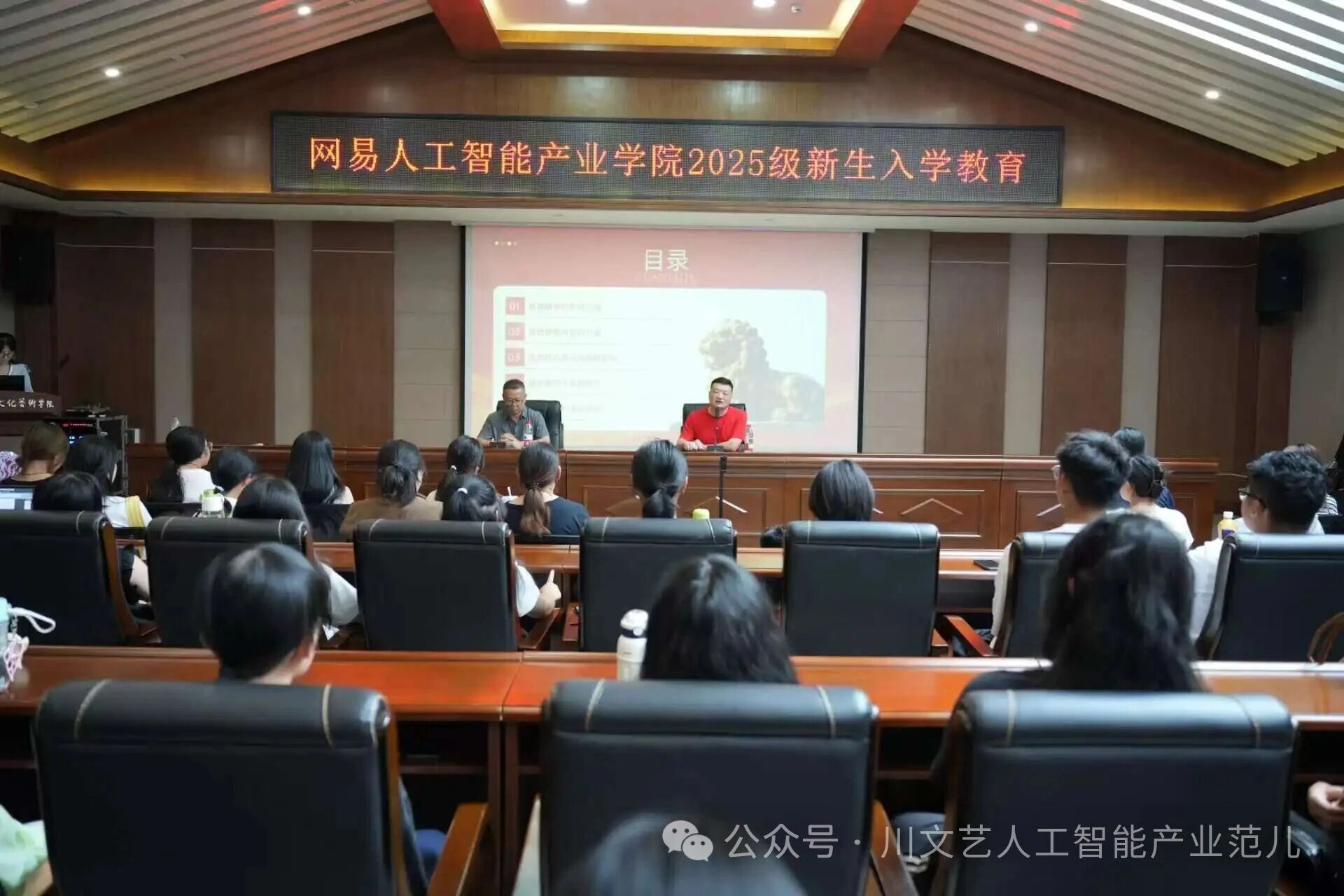2025年9月15日,网易人工智能产业学院2025级新生入学教育第一课在梓潼校区文昌学宫一号会议室成功举办。本次活动以“弘扬抗战精神,铸牢信仰根基”为主题由网易人工智能产业学院副院长(兼)党支部副书记张新,教学副院长周宁共同主讲,旨在引导新生传承红色基因,坚定理想信念。